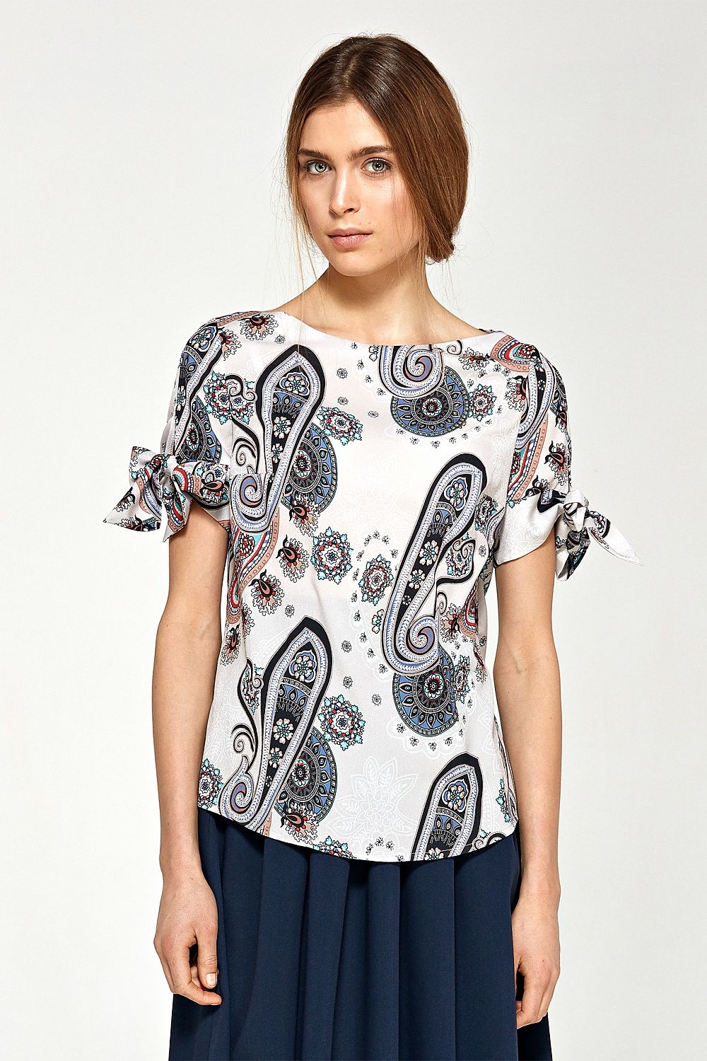Charmante Bluse mit klassischem Bootsausschnitt und dekorativen Bändern an den Ärmeln. Das Modell hat zwei Bänder, die auf verschiedene Weise gebunden werden können, vom klassischen Knoten bis zur Schleife. Das wird Ihre Lieblingsbluse für warme Tage bei der Arbeit und für den Abend!
