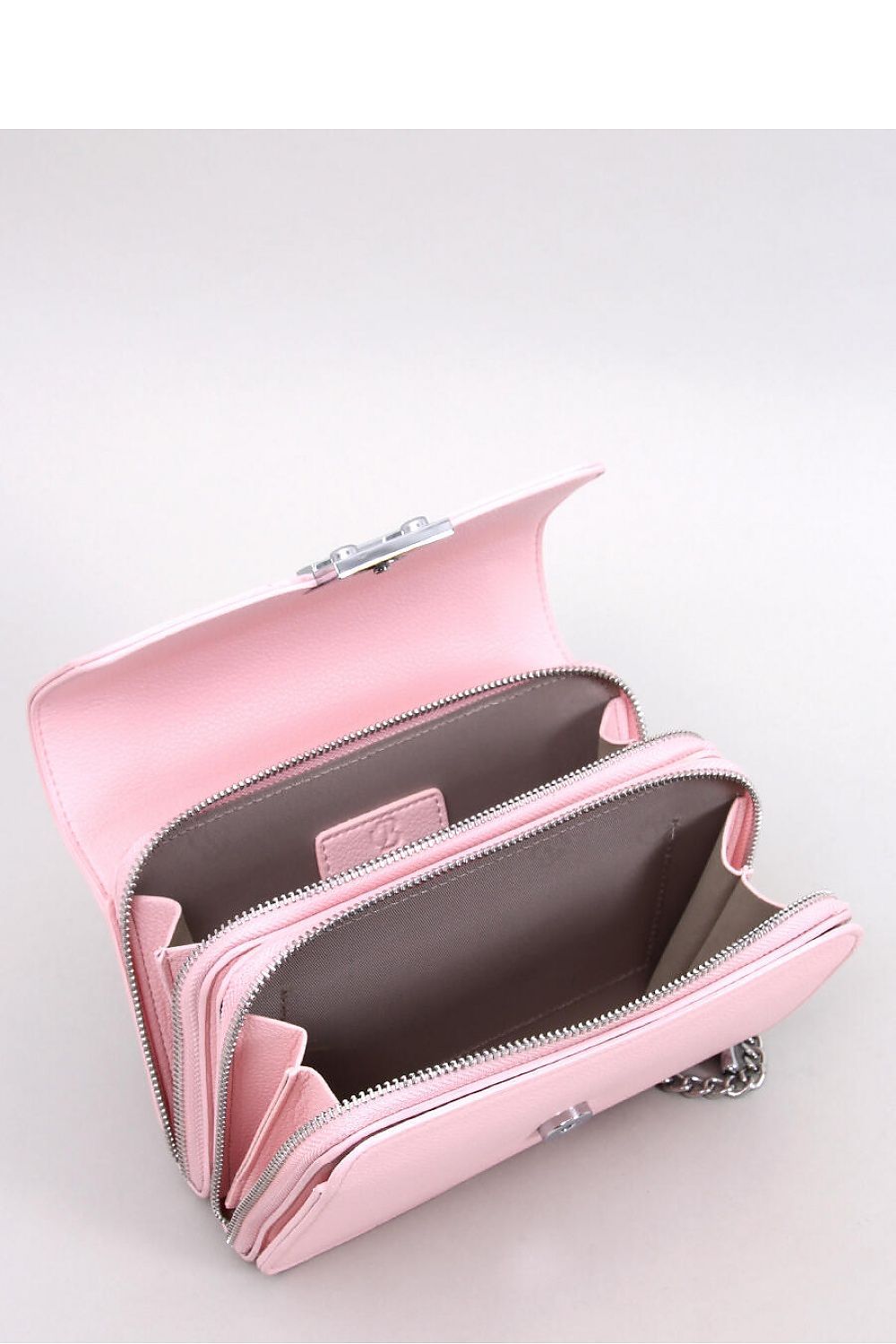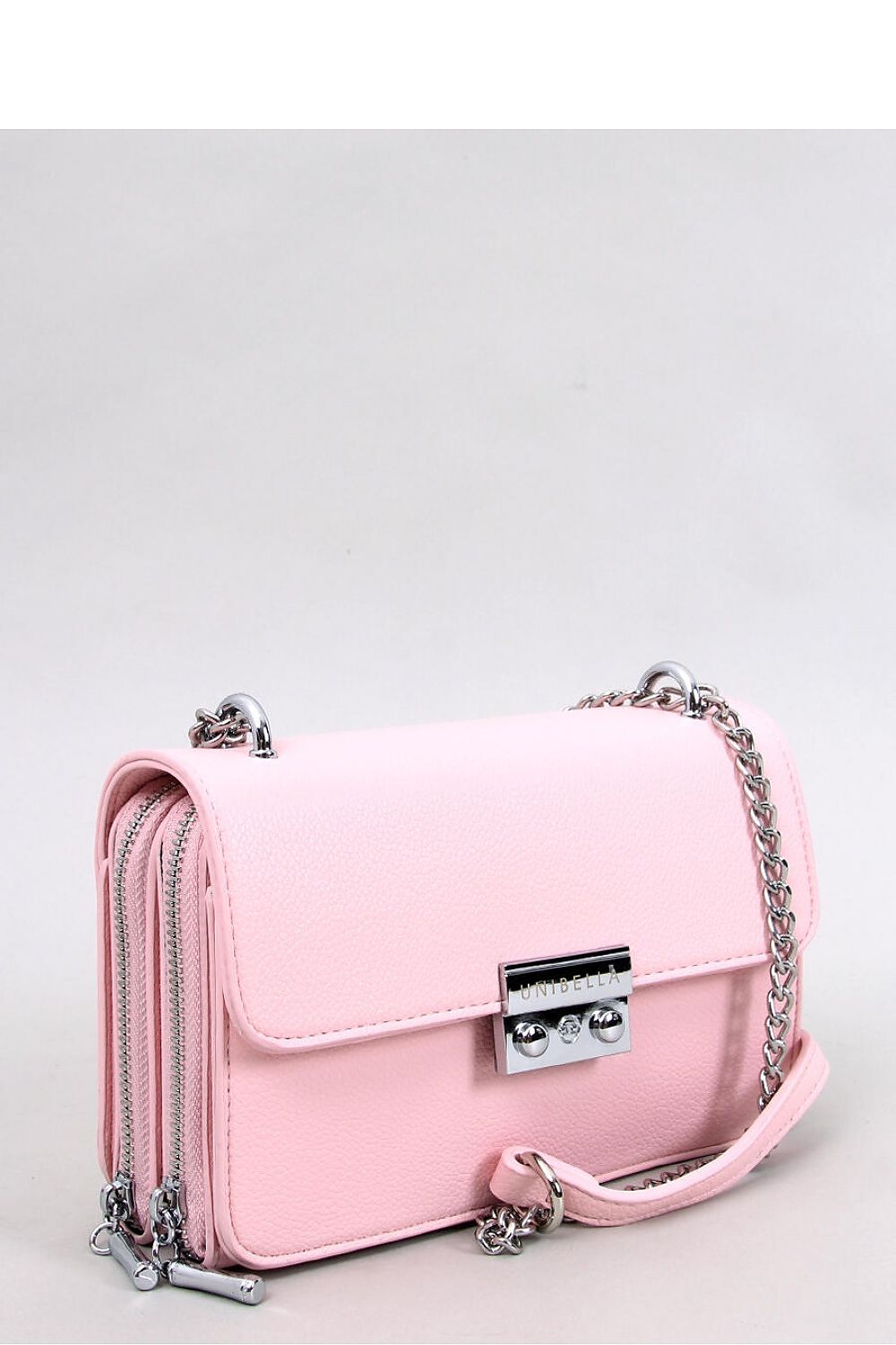 Elegante Damenhandtasche - Postbag. Sie hat einen langen, nicht abnehmbaren Riemen in Form einer silberfarbenen Kette. Sie wird mit einer Klappe mit stilvollem Druckknopfverschluss geschlossen. Im Inneren befinden sich zwei separate Reißverschlussfächer. Sie sieht nicht nur gut aus, sondern ist auch sehr praktisch : ) Äußeres Material: ökologisches Leder.