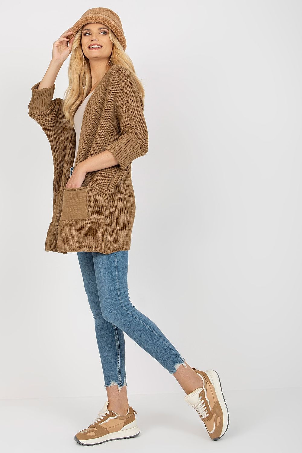 Ungeknöpfter Cardigan mit 3/4-Ärmeln und Eingrifftaschen. Perfekt für eine Reihe von Stilen.