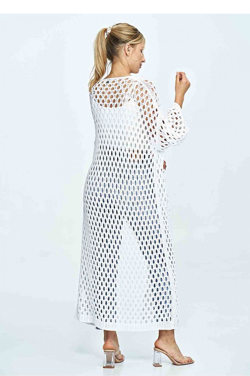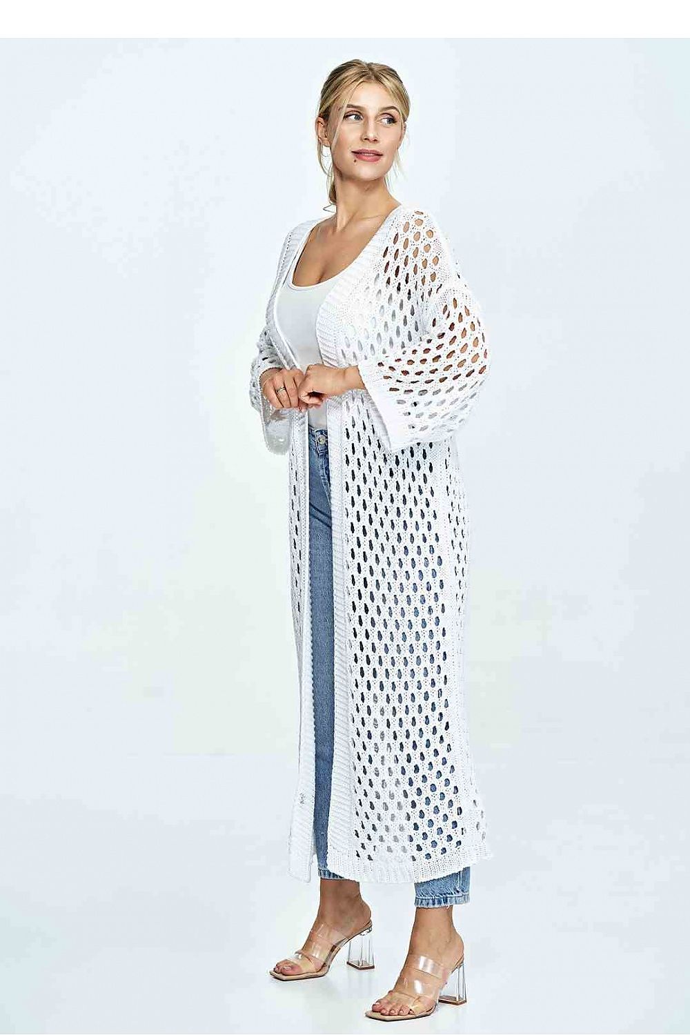 Lange durchbrochene Strickjacke mit weiten 3/4-Ärmeln, ohne Verschluss und mit Taschen.