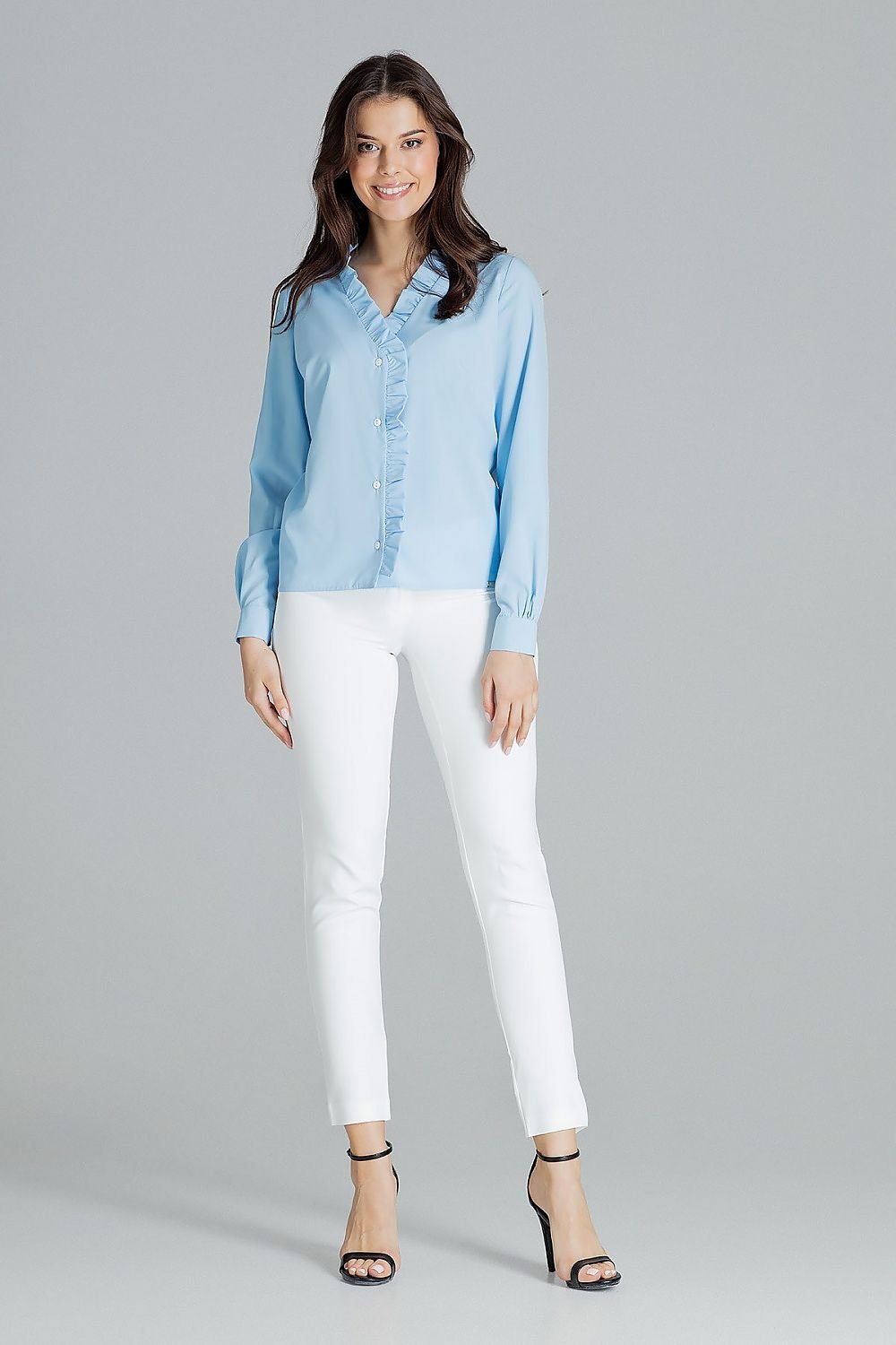 Blaues, klassisches, gerades Hemd mit Herzausschnitt und durchgehender Rüsche. Lange Ärmel mit plissiertem Bündchen. Knopfverschluss vorne.