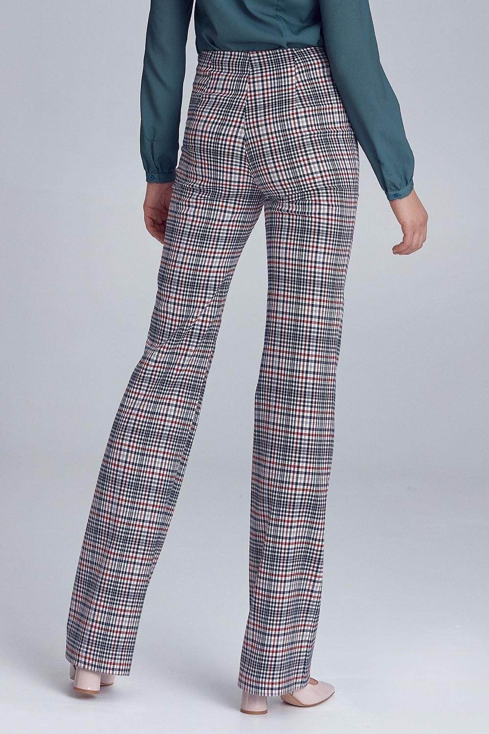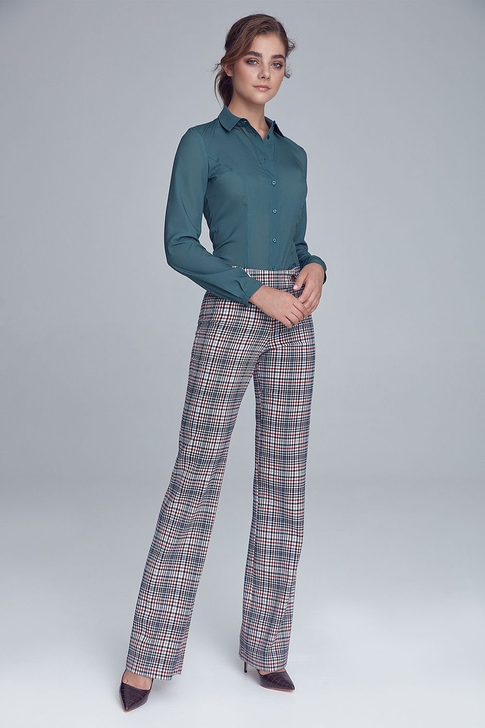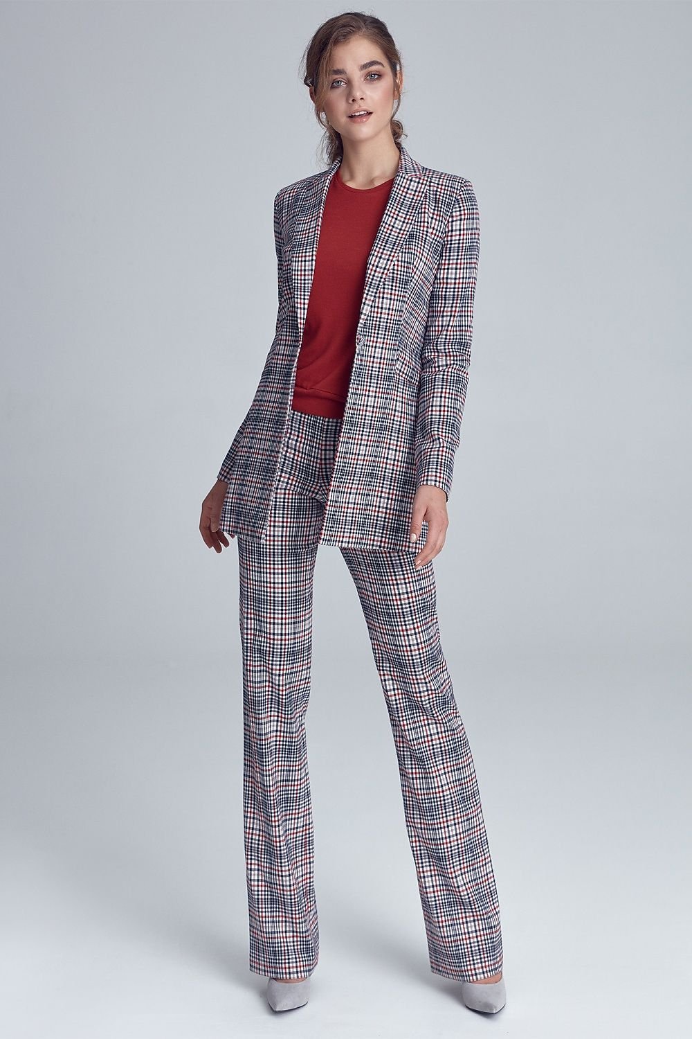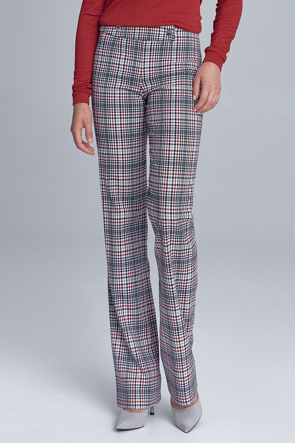 Stylische, weiche Office-Hose in geradem Schnitt mit Zierknöpfen am Bund. Das Modell bildet zusammen mit einer langen Jacke einen kompletten Anzug, dessen Stil an die Pariser Straßen an der Wende der 70er und 80er Jahre erinnert. Die Hose sieht auch solo gut aus, sowohl mit einem Hemd als auch mit einem leichten Herbstpulli.
