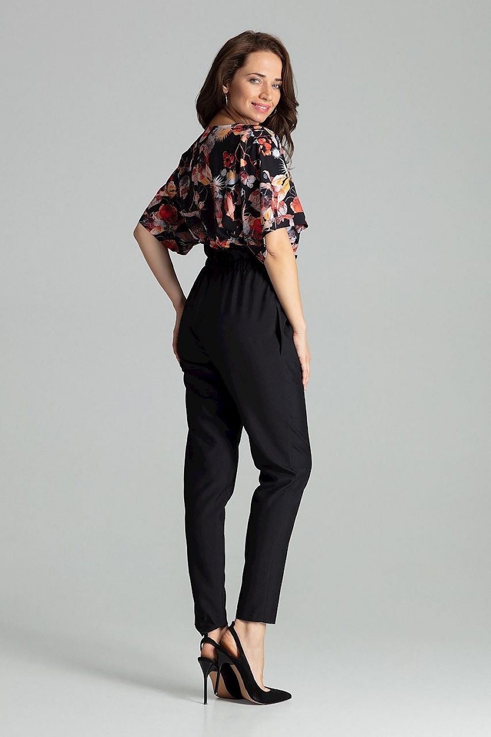 Schwarze lange Hose, nach unten hin leicht verjüngt. Bund mit Falten und eingenähtem 3 cm breiten Gummiband. Gürtel mit einer dekorativen Metallschnalle in Gold. Taschen an den Seitennähten.
