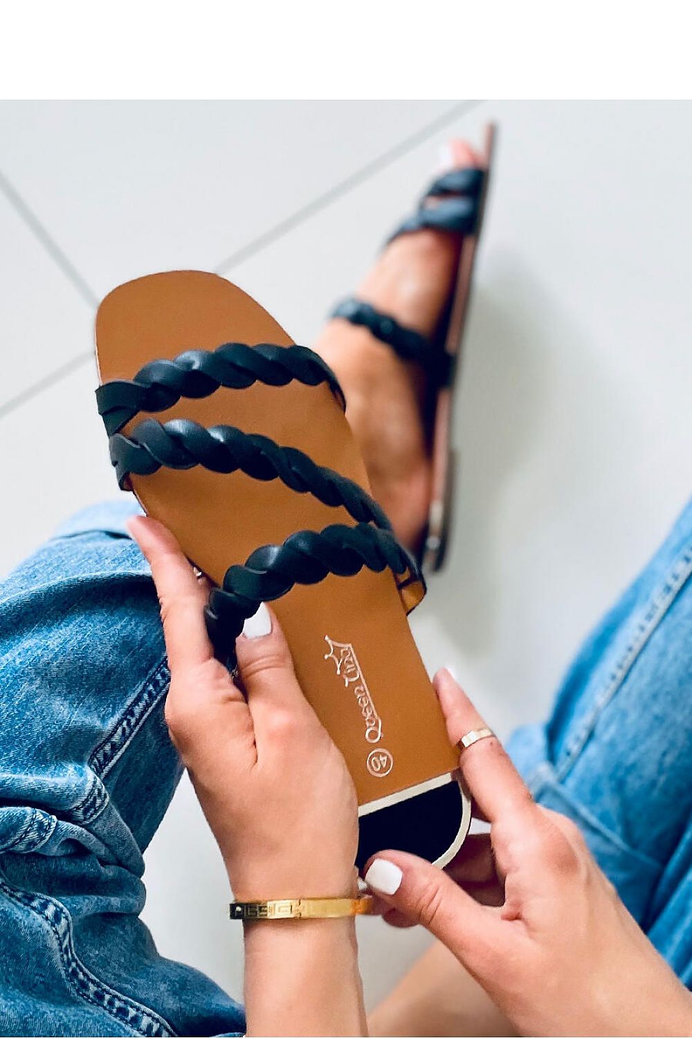 Damen-Flip-Flops mit flacher Sohle. Ein einzigartiges Modell mit geflochtenen Riemen und einer Platte an der Ferse. Flache Flip-Flops sind eine modische, bewährte und unersetzliche Wahl im Sommer : ) Außenmaterial ? ökologisches Leder.