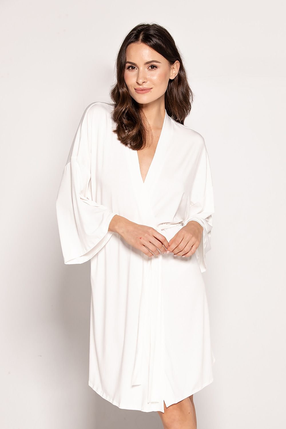 Ein schöner, heller Morgenmantel, in dem Sie sich herrlich entspannen können. Weich, glatt, zart, unglaublich feminin. Die Ärmel sind etwas weiter und werden in der Taille gebunden.