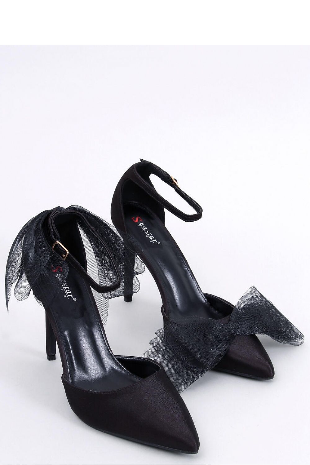Außergewöhnliche Damenpumps auf einem Stilettoabsatz mit einer Höhe von 11 cm. Das Modell zeichnet sich durch schöne Tüllschleifen aus (bei einem Schuh auf der Nase und beim anderen hinten am Schuh) .... Das sinnliche Satin-Finish und die formschöne, spitze Schuhspitze unterstreichen den unkonventionellen Stil.... Was kann man sich mehr wünschen? Dies sind die perfekten Schuhe für besondere Anlässe - Abschlussball, Hochzeit oder Ball....
