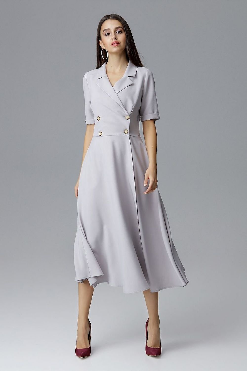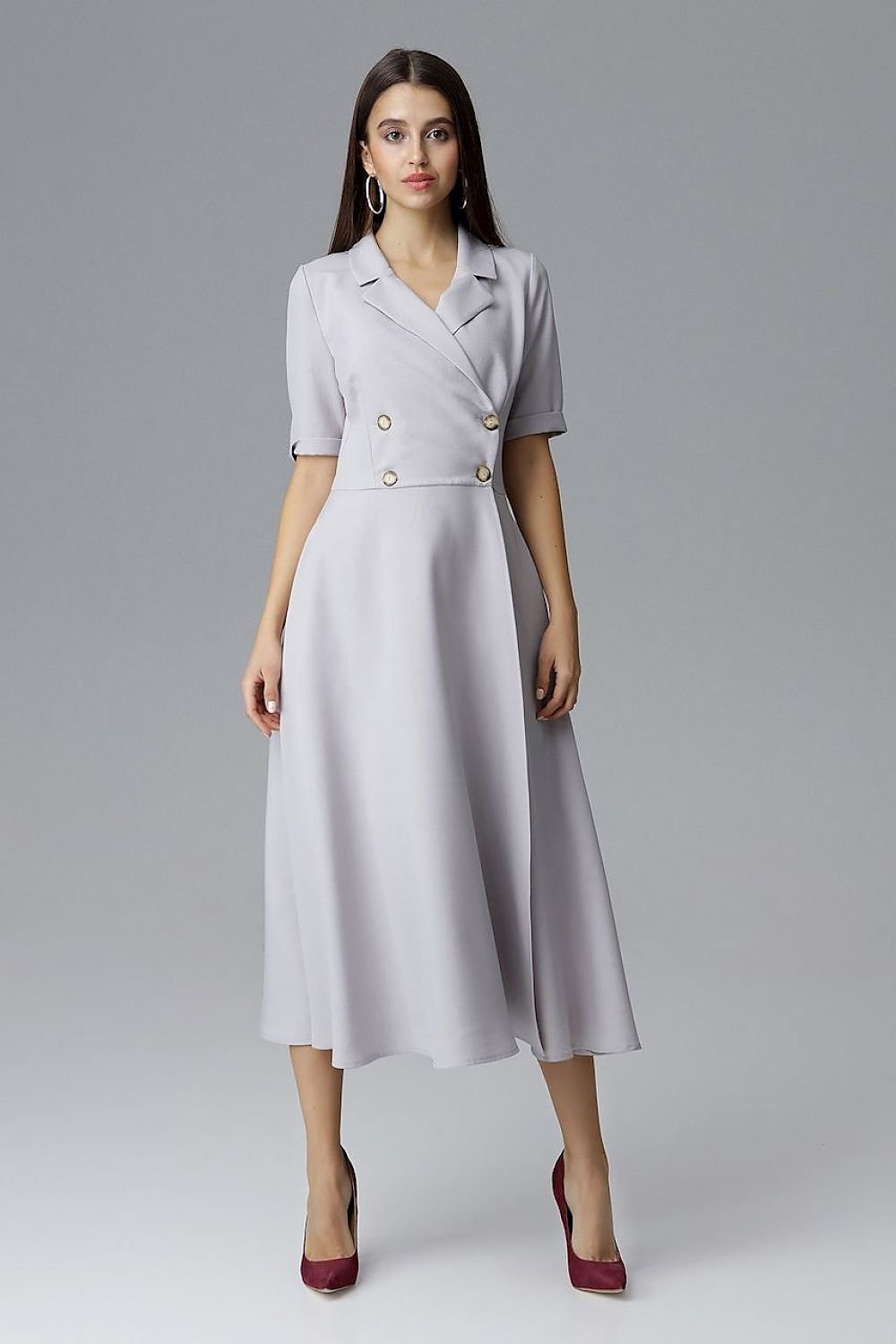 Zweireihiges Kleid in 7/8-Länge mit ausgestelltem Unterteil und Taschen an den Seitennähten. Ausschnitt mit Kragen, 3/4-lange Ärmel mit Manschette.
