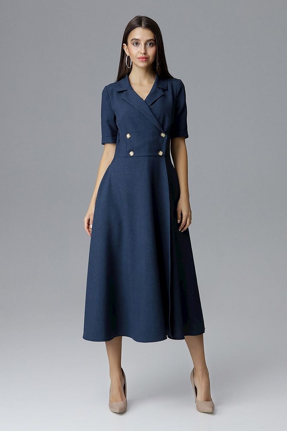 Zweireihiges Kleid in 7/8-Länge mit ausgestelltem Unterteil und Taschen an den Seitennähten. Ausschnitt mit Kragen, 3/4-lange Ärmel mit Manschette.