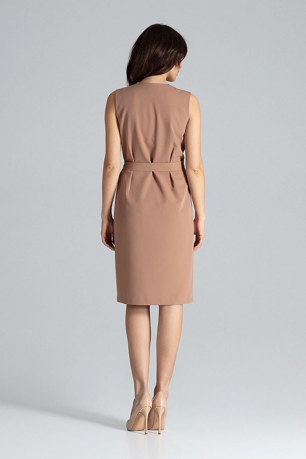 Ärmelloses Midikleid. Bleistiftkleid unten ohne Taschen, mit Gürtel und dekorativer Metallschnalle in Gold. Kuvert-Ausschnitt. Kleid ohne Futter.