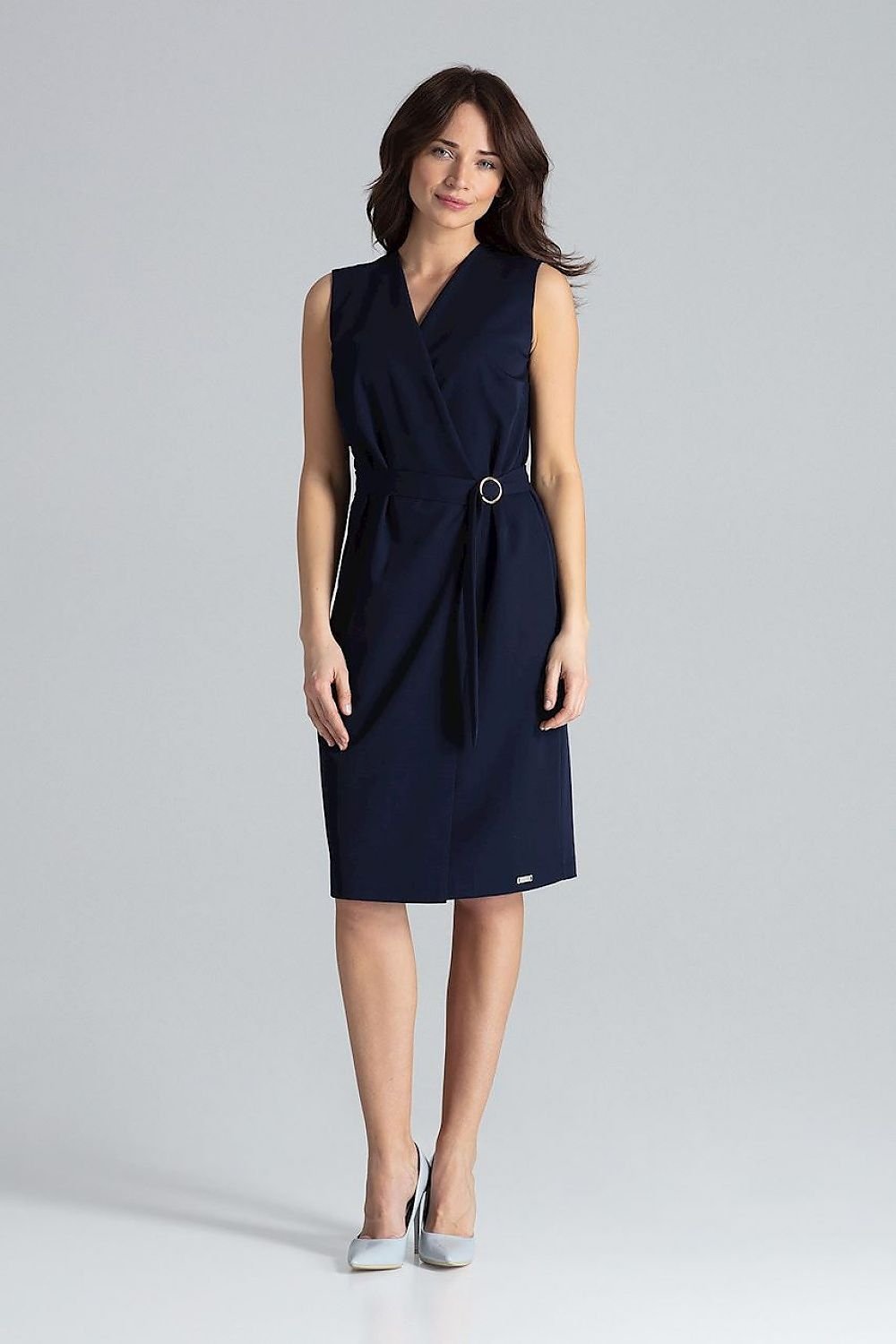 Ärmelloses Midikleid. Bleistiftkleid unten ohne Taschen, mit Gürtel und dekorativer Metallschnalle in Gold. Kuvert-Ausschnitt. Kleid ohne Futter.