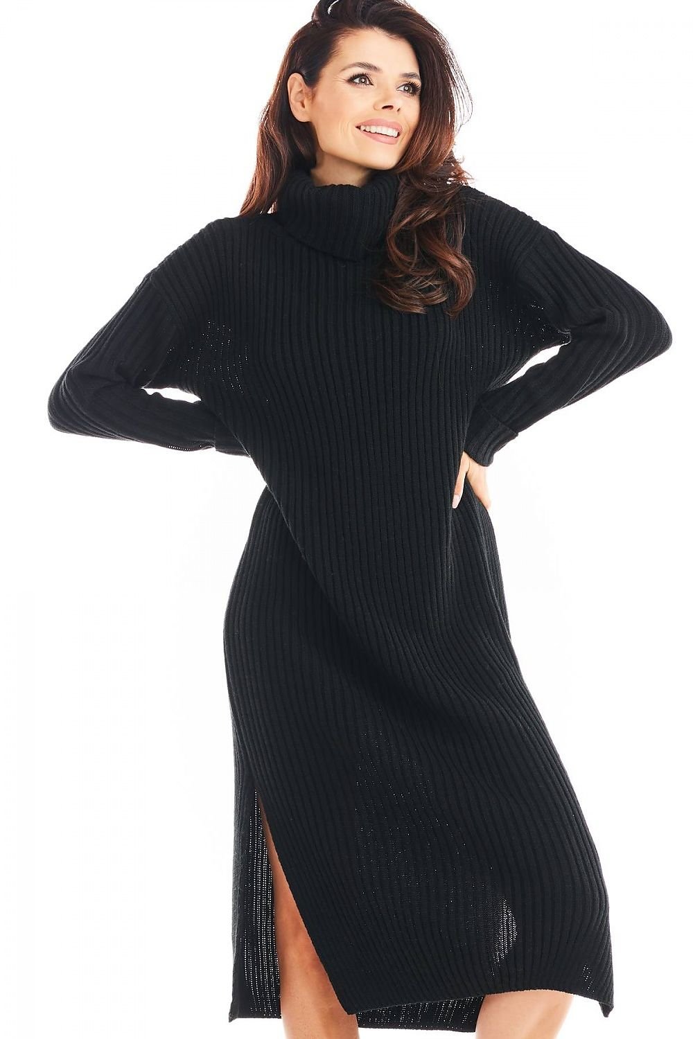 Pulloverkleid mit Rollkragen und langen Ärmeln, Midi-Länge. Ideal für die Herbst- und Wintersaison. Warm, fleischig, gewebt mit einem vertikalen Streifenmuster, das die Figur optisch verschlankt. Ideal für das tägliche Styling.