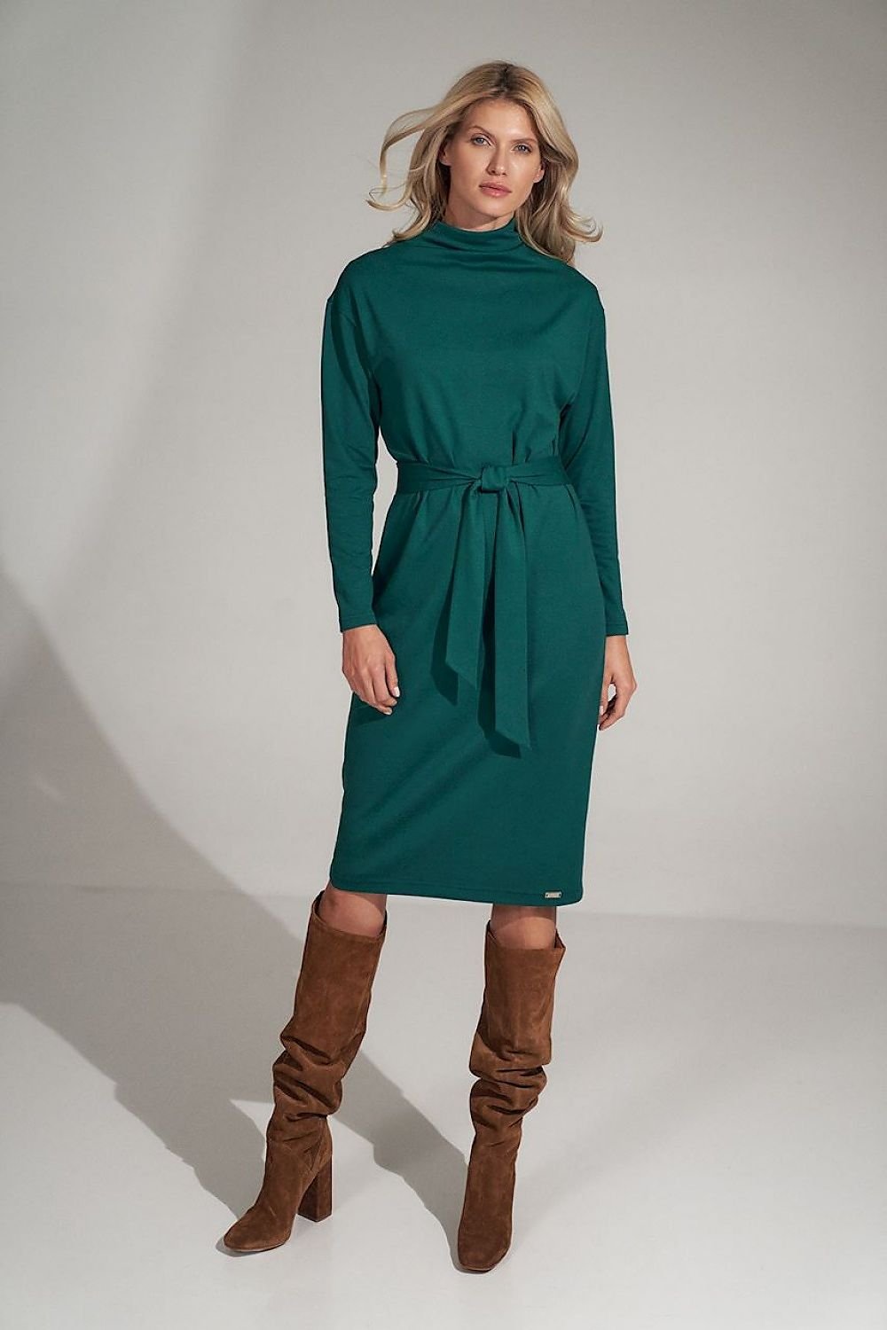 Grünes, schlichtes Midikleid mit Rollkragen und langen Kimonoärmeln. Aufgeknöpft, ungefüttert, mit einem Stoffgürtel gebunden. Elastisches Material.