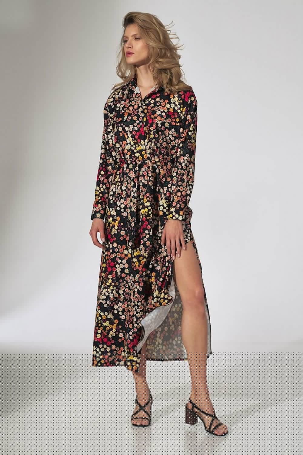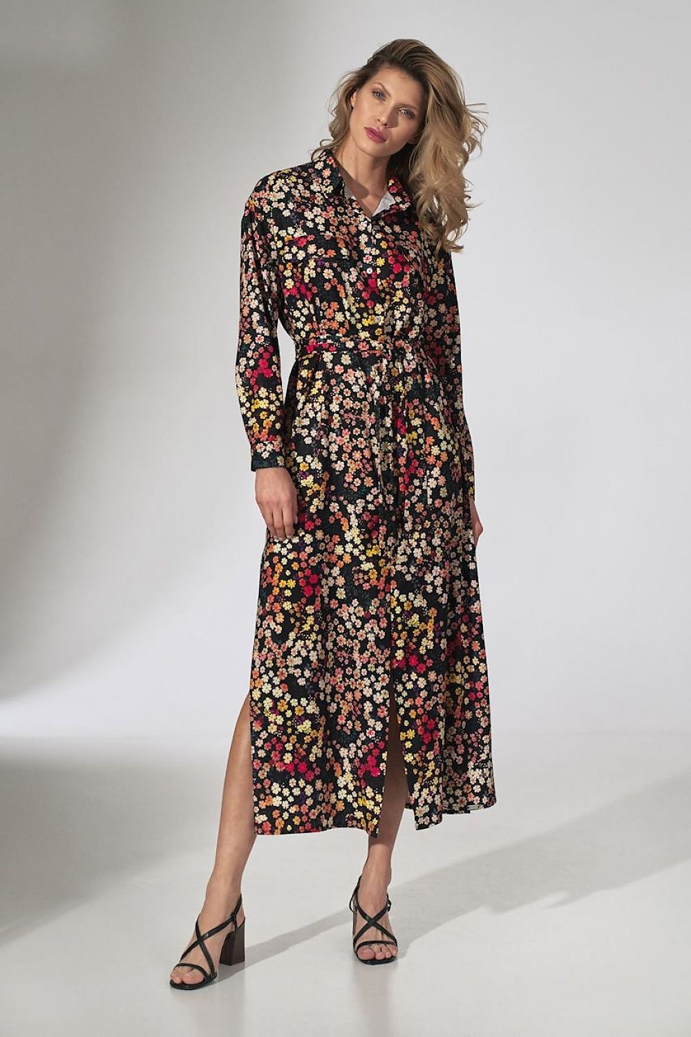 Maxikleid mit Hemdkragen und floralem Muster. Dekorative Patches an der Brustlinie. Lange Ärmel mit geknöpfter Manschette. Geknöpft und in der Taille gebunden. Schlitze an den Seiten. Keine Taschen. Kein Futter.