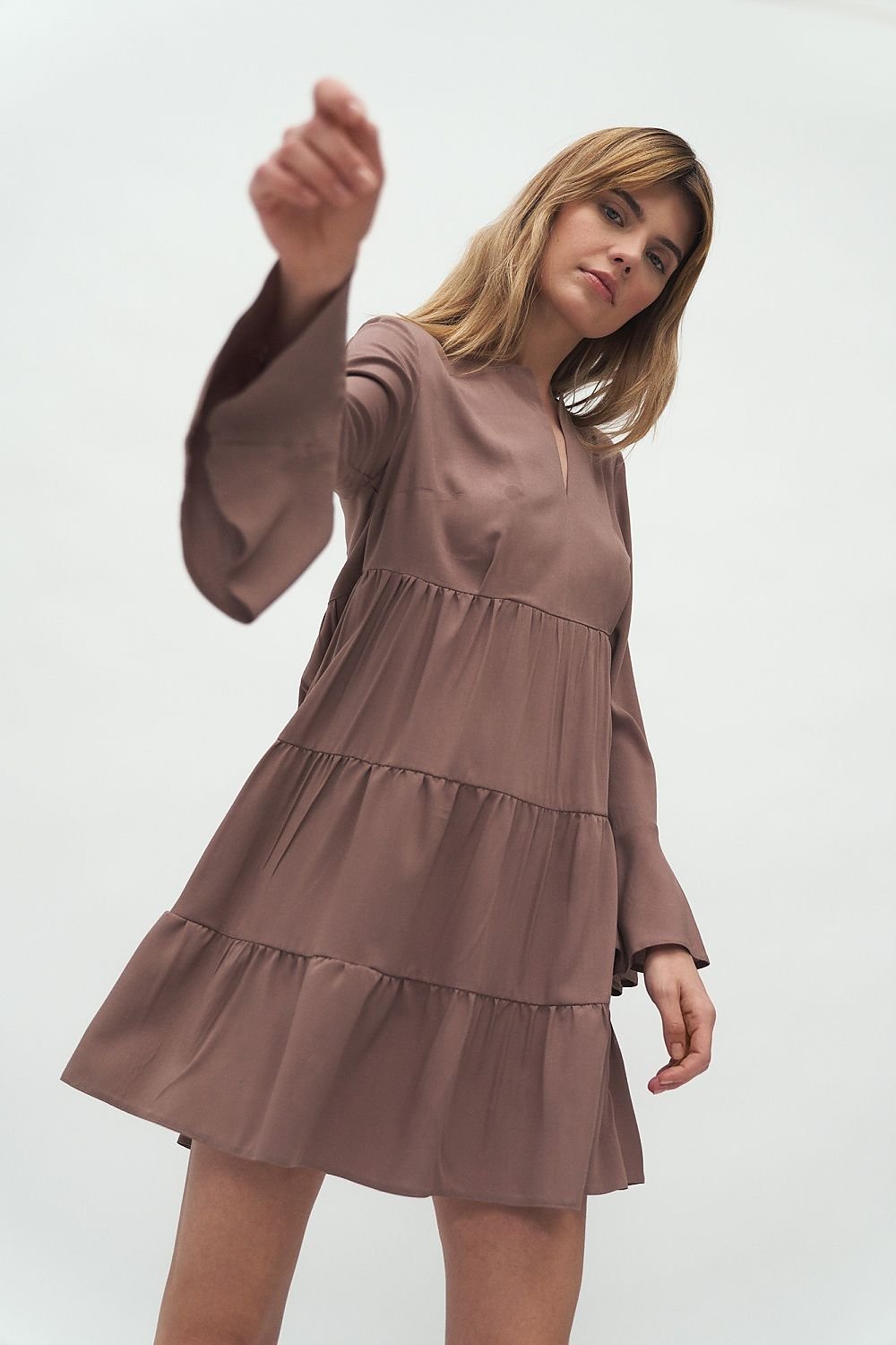 Ein Kleid mit einer Rüsche ist ein sehr feminines Modell. Das Kleid kaschiert perfekt den Bereich von Bauch und Hüften und betont die Beine. Der V-Ausschnitt, die Falten an den Rüschen und die ausgestellten Ärmel machen das Kleid zu einem einzigartigen Kleid für Frauen, die lässige Eleganz schätzen. Das Material, aus dem er genäht ist, gewährleistet einen hohen Tragekomfort.