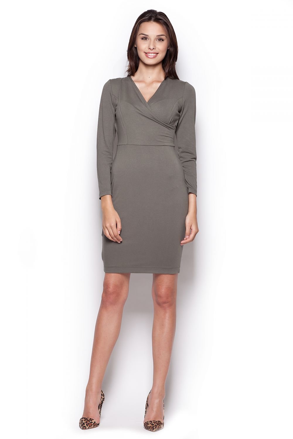 Ein feminines, klassisches, langärmeliges Kleid mit tailliertem Mieder und einem großen Umschlagausschnitt, der die Brust verführerisch freilegt. Ein einfacher, aber eleganter Vorschlag für jede Frau. Ideal für die Arbeit, aber auch für abendliche Treffen.