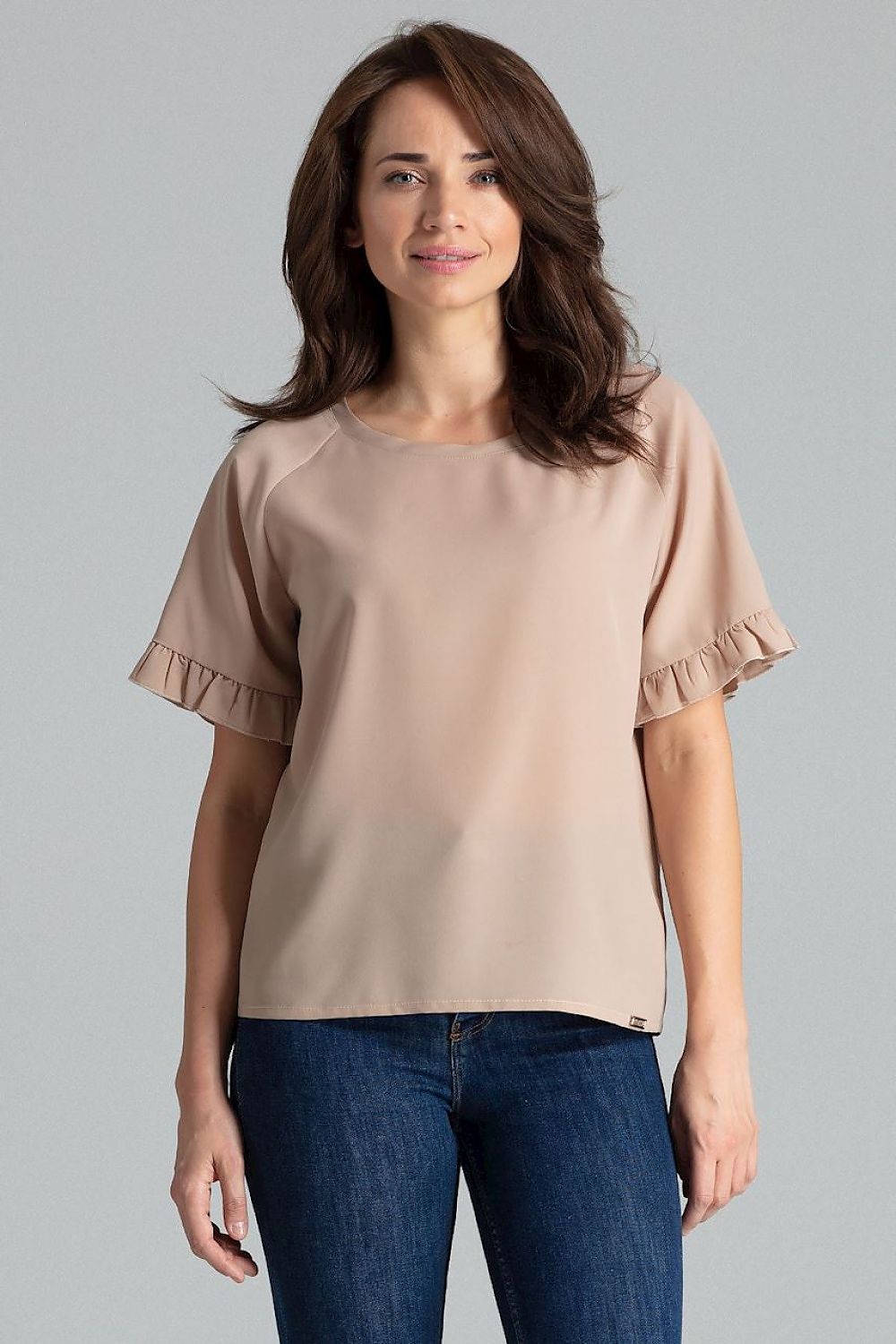 Beigefarbene, schlichte Bluse mit kurzen, gerafften Ärmeln, die mit einer zarten Rüsche abgeschlossen sind. Halbrunder Ausschnitt. Metallemblem mit Markenlogo am linken unteren Rand.