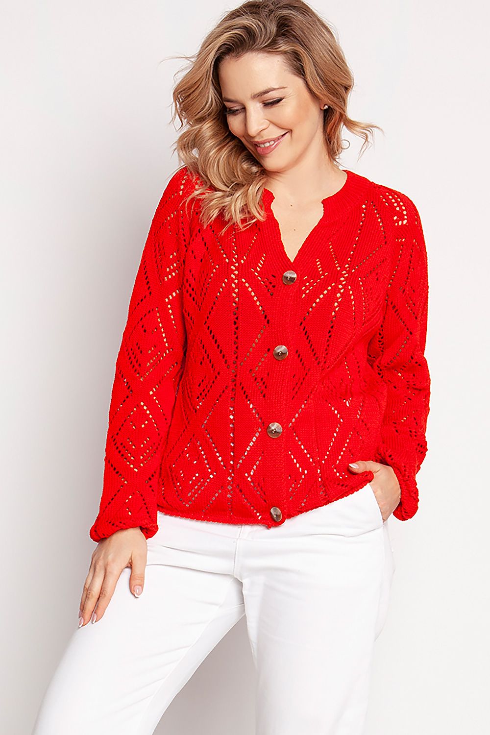 Die Frühjahr/Sommer-Inkarnation des modischen Bomberpullovers. Zarte geometrische Durchbrüche verleihen der übergroßen Form Leichtigkeit und Luftigkeit. Schlankere Silhouette, interessanter spitzer Ausschnitt, lange Ärmel, Zierknöpfe.