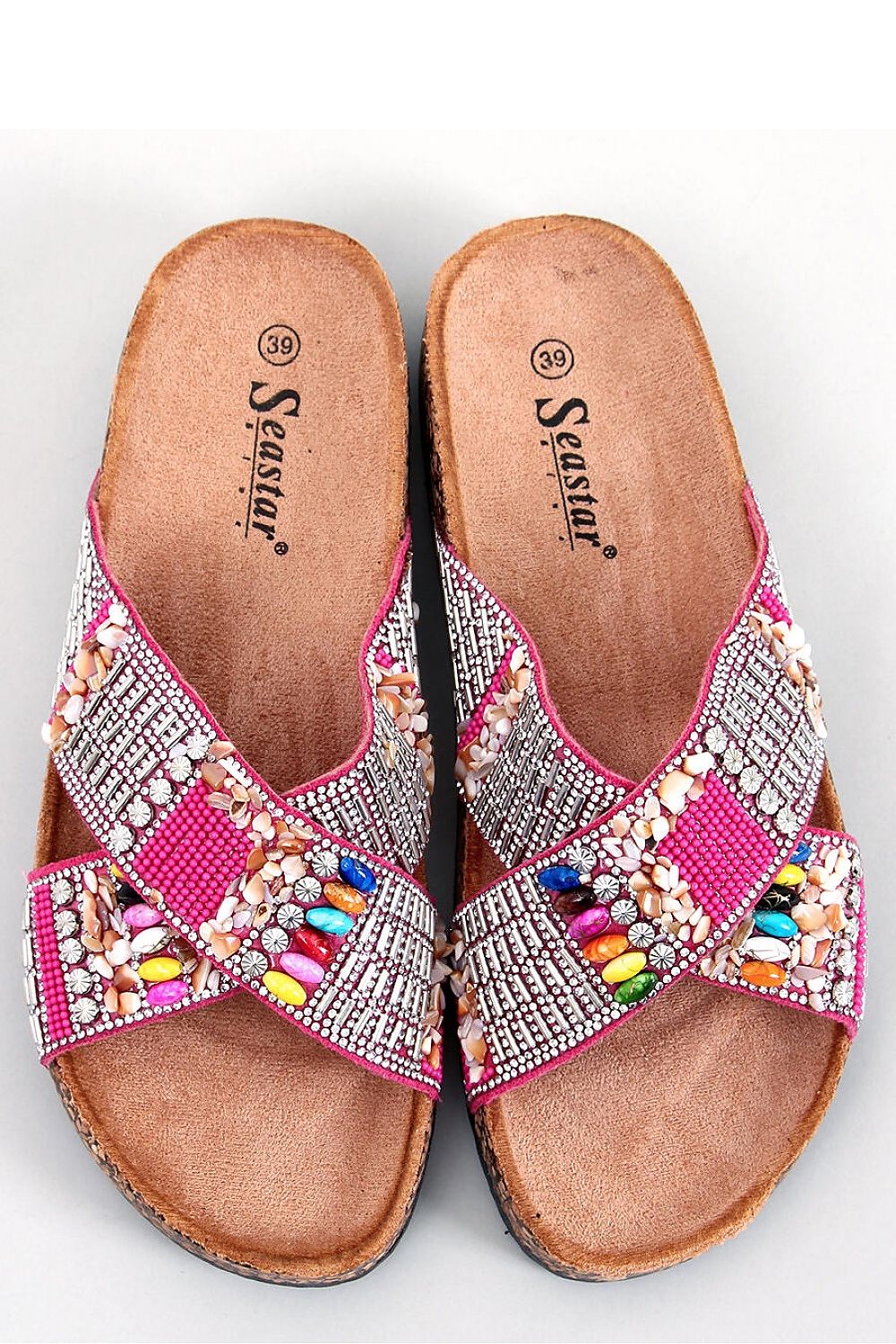 Damen-Flip-Flops auf einer Korksohle. Der Blickfang sind die bunten Perlen und funkelnden Zirkone im Ethno-Stil. Das Ganze ergibt einen sehr stimmigen Urlaubslook.... Die perfekt geformte und mit Stoff gefütterte Innensohle ist perfekt für lange Sommerspaziergänge: ) Obermaterial ? ökologisches Wildleder.